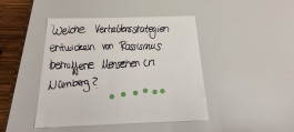 Im Rahmen einer Mehrheitsabstimmung entschied sich die Gruppe für die Frage: „Welche Verhaltensstrategien entwickeln von Rassismus betroffene Menschen in Nürnberg?“