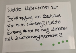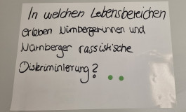 Der theoretischen Erläuterung folgte die konkrete Wahl des Forschungsschwertpunktes. Dabei zogen die Mitforschenden eine einfache Mehrheitsentscheidung einer Konsensentscheidung vor und stimmten für das Thema „Rassismus/Diskriminierung in Nürnberg“. Dieses Ergebnis überrascht wenig, da die Gruppe diese Thematik von Anfang an aktiv benannt und diskutiert hatte.