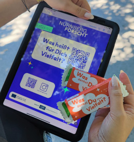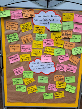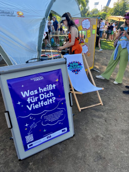 Ziel der Mitmach-Forschung war es, das Vielfaltsverständnis der Festivalbesucher*innen zu verstehen und herauszufinden, wie Menschen das Festival erleben und welche Rolle Vielfalt für sie spielt. Die Antworten wurden live über Monitore am Stand ausgespielt, konnten aber auch auf dem eigenen Smartphone via QR Code verfolgt werden. Viele Besucher*innen hinterließen Ideen und Vorschläge, was Festivals in puncto Inklusion, Sicherheit, Awareness, Diversität und Nachhaltigkeit optimieren könnten.